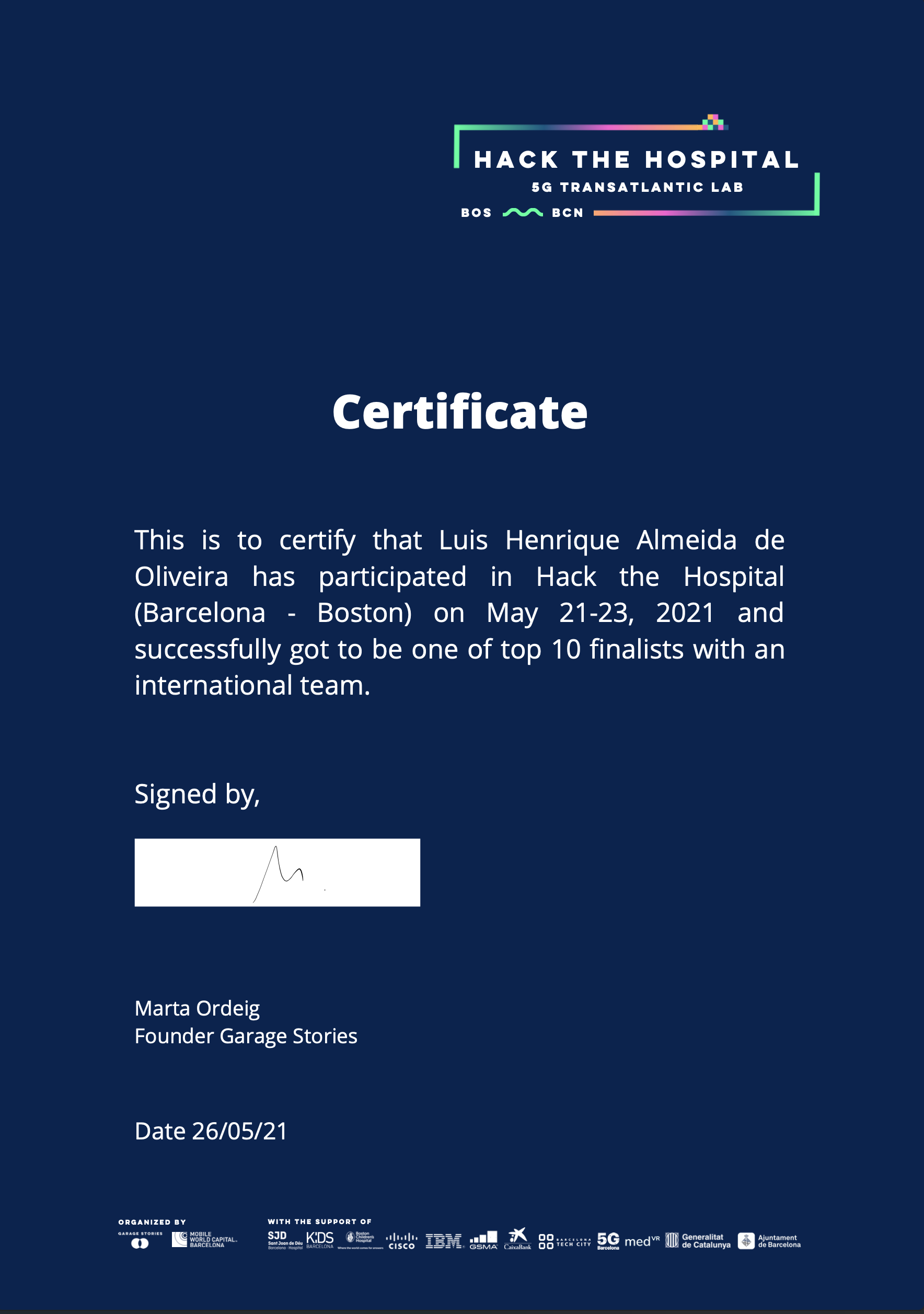 Hack the Hospital was a hackathon organised by Mobile World Capital Barcelona & Garage Stories, aiming to improve pediatric patients' quality of life using emerging tech. Together with a group, we developed a solution that managed to be among the top 10 finalists of the initiative.