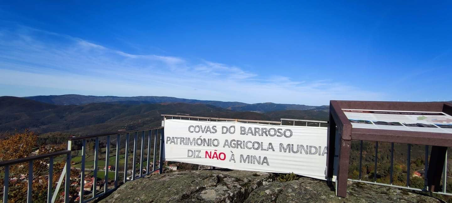 Foto de uma faixa de protesto contra a mina de lítio. "Covas do Barroso, patrimônio agrícola mundial, diz não à mina". Foto: Associação Unidos em Defesa de Covas do Barroso. Utilizada com permissão.